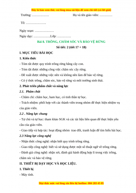 Giáo án Công nghệ 7 Bài 8 (Kết nối tri thức): Trồng, chăm sóc và bảo vệ rừng