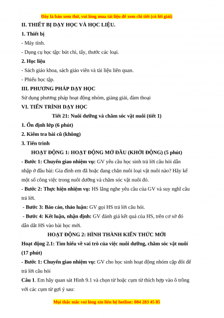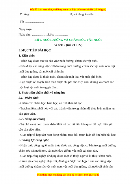 Giáo án Công nghệ 7 Cánh diều Bài 9: Nuôi dưỡng và chăm sóc vật nuôi