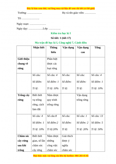 Ma trận đề học kì I, Công nghệ 7, Cánh diều Nhận biết Thông Vận dụng Vận dụng Tổng hiểu cao Giới thiệu Phân biệt chung về được các rừng loại rừng Số câu: Số câu: 4 Số câu: Số câu: Số câu: 4 Số điểm: Số điểm: 1 Số điểm: Số điểm: Số điểm: 1 Tỉ lệ: Tỉ lệ: 10% Tỉ lệ: Tỉ lệ: Tỉ lệ: 10%