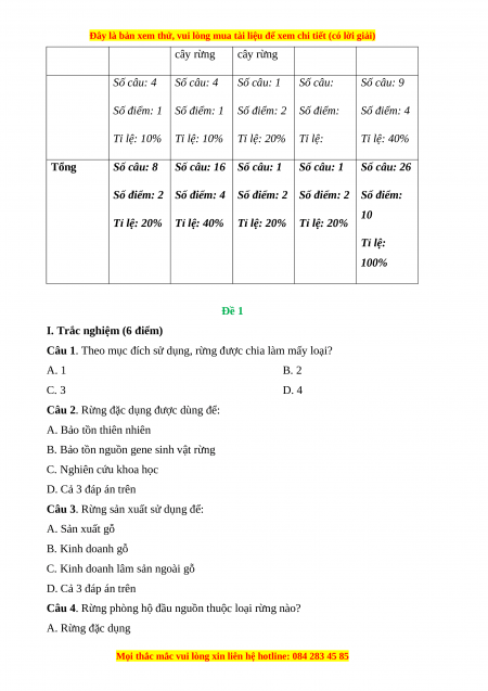Câu 1. Theo mục đích sử dụng, rừng được chia làm mấy loại? A. 1 B. 2 C. 3 D. 4