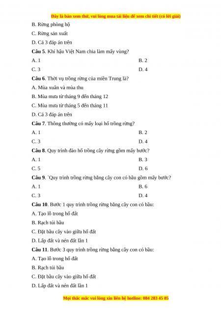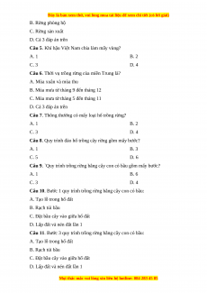 Câu 8. Quy trình đào hố trồng cây rừng gồm mấy bước? A. 1 B. 3 C. 5 D. 6
