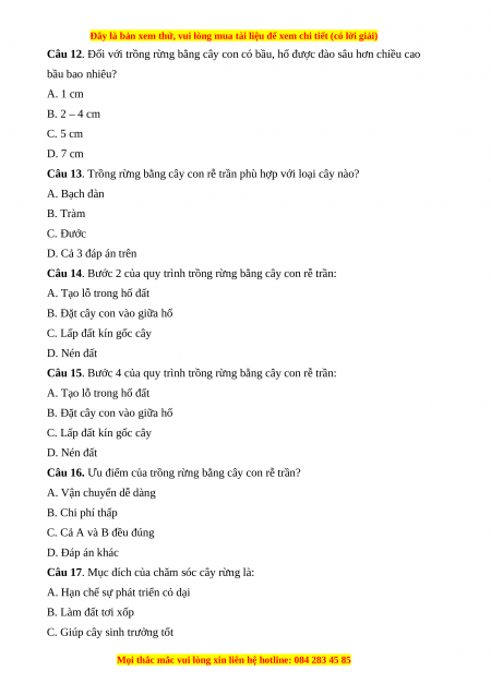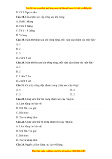 Câu 12. Đối với trồng rừng bằng cây con có bầu, hố được đào sâu hơn chiều cao bầu bao nhiêu? A. 1 cm B. 2 – 4 cm C. 5 cm D. 7 cm