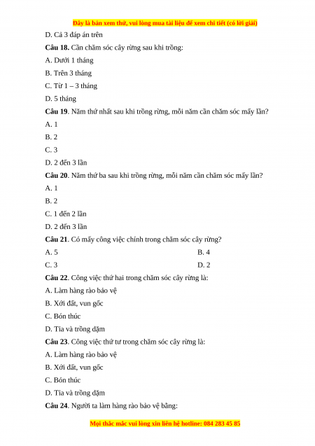 Câu 19. Năm thứ nhất sau khi trồng rừng, mỗi năm cần chăm sóc mấy lần?