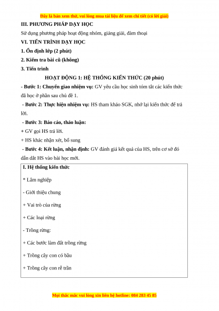 I. Hệ thống kiến thức * Lâm nghiệp - Giới thiệu chung + Vai trò của rừng + Các loại rừng - Trồng rừng: