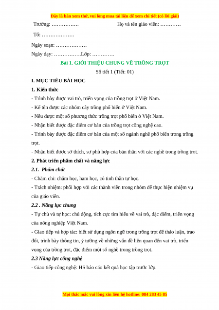 Bài 1. GIỚI THIỆU CHUNG VỀ TRỒNG TRỌT Số tiết 1 (Tiết: 01)