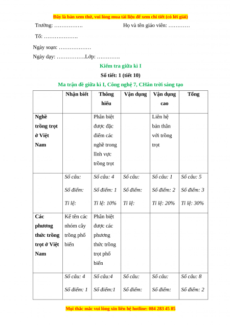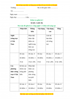 Ma trận đề giữa kì I, Công nghệ 7, CHân trời sáng tạo Nhận biết Thông Vận dụng Vận dụng Tổng hiểu cao Nghề Phân biệt Liên hệ trồng trọt được đặc bản thân ở Việt điểm các với trồng Nam nghề trong trọt lĩnh vực trồng trọt Số câu: Số câu: 4 Số câu: Số câu: 1 Số câu: 5 Số điểm: Số điểm: 1 Số điểm: