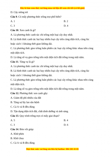 Câu 9. Có mấy phương thức trồng trọt phổ biến? A. 1 B. 2 C. 3 D. 4