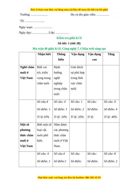 Giáo án Công nghệ 7 Kiểm tra giữa kì 2 (Chân trời sáng tạo)
