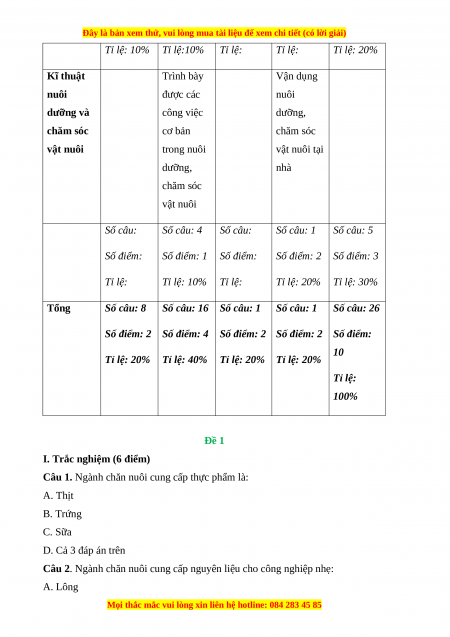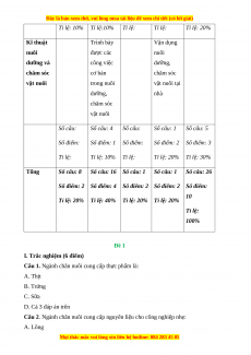 Tỉ lệ: 10% Tỉ lệ:10% Tỉ lệ: Tỉ lệ: Tỉ lệ: 20% Kĩ thuật Trình bày Vận dụng nuôi được các nuôi dưỡng và công việc dưỡng, chăm sóc cơ bản chăm sóc vật nuôi trong nuôi vật nuôi tại dưỡng, nhà chăm sóc vật nuôi Số câu: Số câu: 4 Số câu: Số câu: 1 Số câu: 5 Số điểm: Số điểm: 1 Số điểm: Số điểm: 2 Số điểm: 3 Tỉ lệ: Tỉ lệ: 10% Tỉ lệ: Tỉ lệ: 20% Tỉ lệ: 30% Tổng Số câu: 8