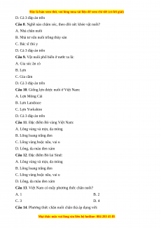 Câu 10. Giống lợn được nuôi ở Việt Nam: A. Lợn Móng Cái B. Lợn Landrace C. Lợn Yorkshire D. Cả 3 đáp án trên