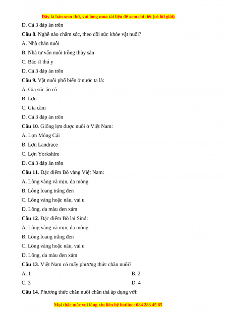 Câu 9. Vật nuôi phổ biến ở nước ta là: A. Gia súc ăn cỏ B. Lợn C. Gia cầm D. Cả 3 đáp án trên