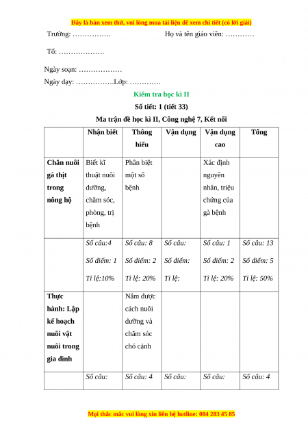 Ma trận đề học kì II, Công nghệ 7, Kết nối Nhận biết Thông Vận dụng Vận dụng Tổng hiểu cao Chăn nuôi Biết kĩ Phân biệt Xác định gà thịt thuật nuôi một số nguyên trong dưỡng, bệnh nhân, triệu nông hộ chăm sóc, chứng của phòng, trị gà bệnh bệnh Số câu:4 Số câu: 8 Số câu: Số câu: 1 Số câu: 13 Số điểm: 1 Số điểm: 2 Số điểm: Số điểm: 2 Số điểm: 5 Tỉ lệ:10% Tỉ lệ: 20% Tỉ lệ: Tỉ lệ: 20% Tỉ lệ: 50% Thực Nắm được hành: Lập cách nuôi kế hoạch dưỡng và nuôi vật chăm sóc nuôi trong chó cảnh gia đình Số câu: Số câu: 4 Số câu: Số câu: Số câu: 4