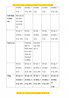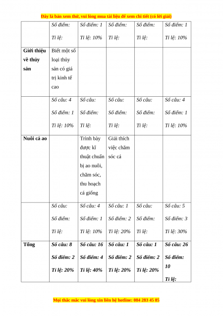 Giới thiệu Biết một số về thủy loại thủy sản sản có giá trị kinh tế cao Số câu: 4 Số câu: Số câu: Số câu: Số câu: 4 Số điểm: 1 Số điểm: Số điểm: Số điểm: Số điểm: 1 Tỉ lệ: 10% Tỉ lệ: Tỉ lệ: Tỉ lệ: Tỉ lệ: 10% Nuôi cá ao Trình bày Giải thích được kĩ việc chăm thuật chuẩn sóc cá bị ao nuôi, chăm sóc, thu hoạch cá giống Số câu: Số câu: 4 Số câu: 1 Số câu: Số câu: 5 Số điểm: Số điểm: 1
