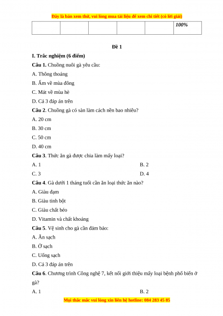 Câu 1. Chuồng nuôi gà yêu cầu: A. Thông thoáng B. Ấm về mùa đông C. Mát về mùa hè D. Cả 3 đáp án trên