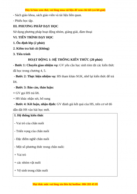 - Một số phương thức trong chăn nuôi: + Vai trò + các nhóm vật nuôi + Vệ sinh trong chăn nuôi