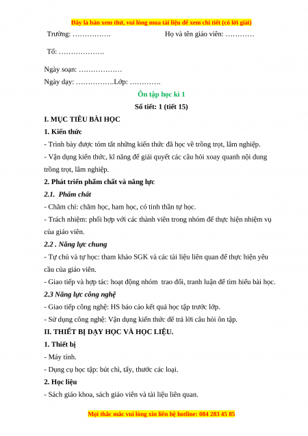 Giáo án Công nghệ 7 Ôn tập học kì 1 (Kết nối tri thức)