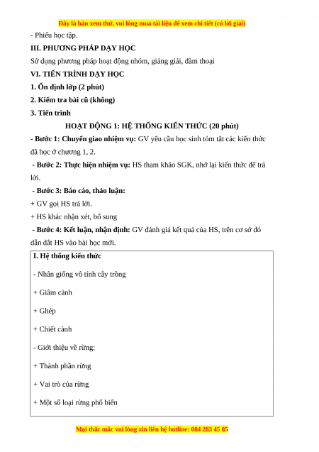 - Nhân giống vô tính cây trồng + Giâm cành + Ghép + Chiết cành - Giới thiệu về rừng: + Thành phần rừng + Vai trò của rừng