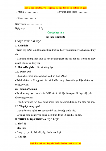 Giáo án Công nghệ 7 Ôn tập học kì 2 (Kết nối tri thức)