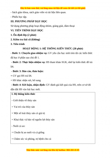 - Trình bày được tóm tắt những kiến thức đã học về nuôi trồng và chăm sóc thủy sản.
