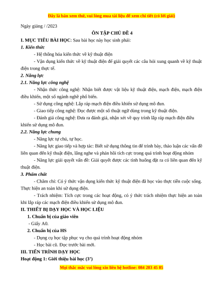 Giáo án Công nghệ 8 Cánh diều: Ôn tập chủ đề 4