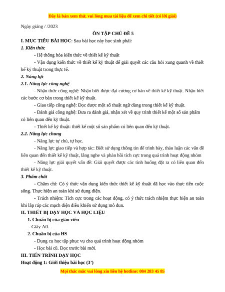 Giáo án Công nghệ 8 Cánh diều: Ôn tập chủ đề 5