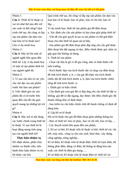 1. Mục đích của thiết kế kĩ thuật là tạo ra sản phẩm đáp ứng GV chia lớp làm 4 nhóm,