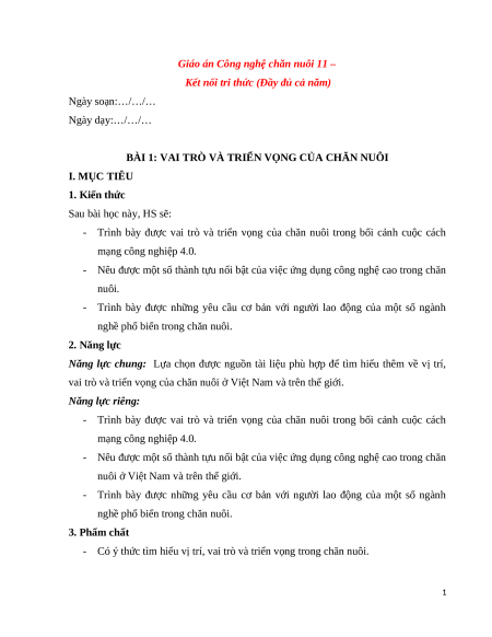 Bộ giáo án Công nghệ chăn nuôi 11 Kết nối tri thức đã cập nhật đủ Cả năm.