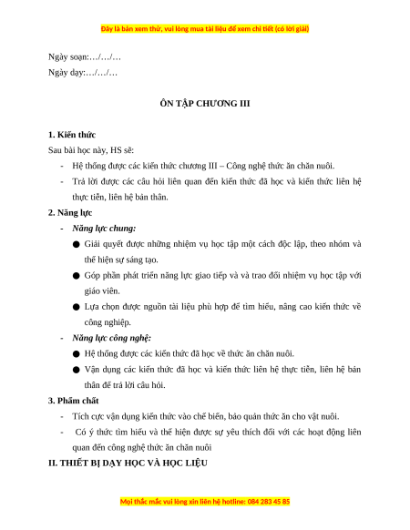 Giáo án Công nghệ chăn nuôi 11 Kết nối tri thức: Ôn tập chương III