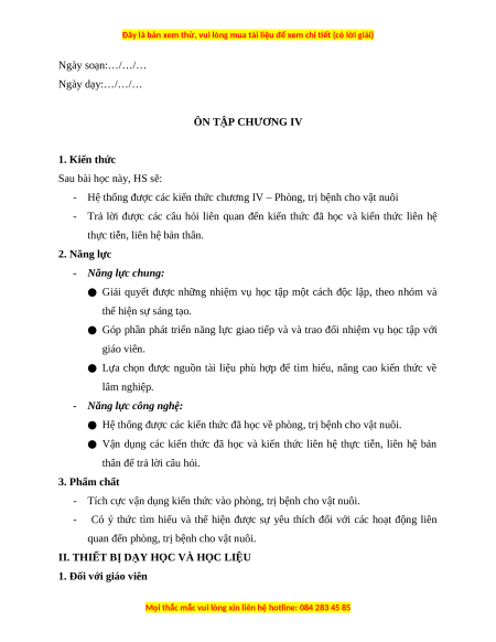 Giáo án Công nghệ chăn nuôi 11 Kết nối tri thức: Ôn tập chương IV