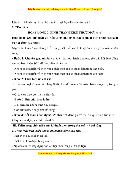 và đời sống; triển vọng phát triển của kĩ thuật điện trong sản xuất, bảo vệ môi trường và