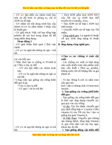 II. ứng d ng công ngh ụ gen. ệ chính. - GV y/c hs ngh/c u ứ thông tin sgk ->trả l i ờ 1.Tạo ra các ch ng ủ vi sinh v t ậ các câu h i ỏ sau: m i ớ . ? M c ụ đích t o ạ ra ch ng ủ vi SVm i ớ là - Các ch ng ủ vsv m i ớ có khả năng gì.? Nêu ví d c ụ t ụ h . ể s n ả xu t ấ nhi u ề lo i ạ s n ả ph m ẩ sinh - GV cho đ i ạ di n ệ các nhóm trình h c ọ cần thi t ế ( Như aa, prôtêin, bày. kháng sinh) v i ớ số lư ng l ợ n và gi ớ á - GV y/c hs ngh/c u ứ thông tin sgk và thành rẻ. tr l ả i ờ : ? Công vi c ệ t o ạ gi ng ố cây tr ng ồ bi n ế - Ví d : ụ Dùng E.coli và n m ấ men đổi gen là gì. cấy gen mã. ? Cho ví d c ụ t ụ h . ể hoá s n ả ra kháng sinh và hoocmon - GV g i ọ 1 vài hs tr l ả i ờ . Insulin. 2. Tạo gi ng ố cây tr ng ồ ph ổ bi n ế đ i ổ gen. - T o ạ gi ng ố cây tr ng ồ bi n ế đ i ổ gen là lĩnh v c ự ng ứ d ng ụ chuy n ể các gen quý vào cây trồng. - Ví d : ụ Cây lúa đư c ợ chuy n ể gen quy đ nh ị t ng ổ h p ợ ò- Caroten ( ti n ề