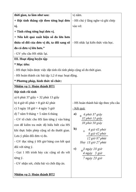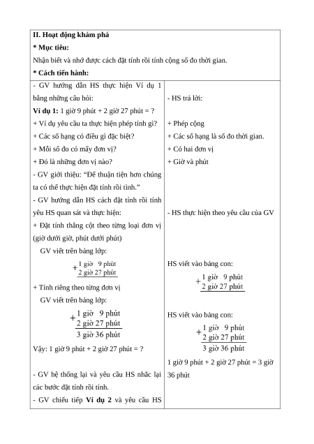 Nhận biết và nhớ được cách đặt tính rồi tính cộng số đo thời gian. * Cách tiến hành: