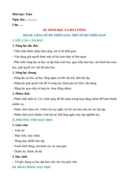 BÀI 69. CỘNG SỐ ĐO THỜI GIAN. TRỪ SỐ ĐO THỜI GIAN