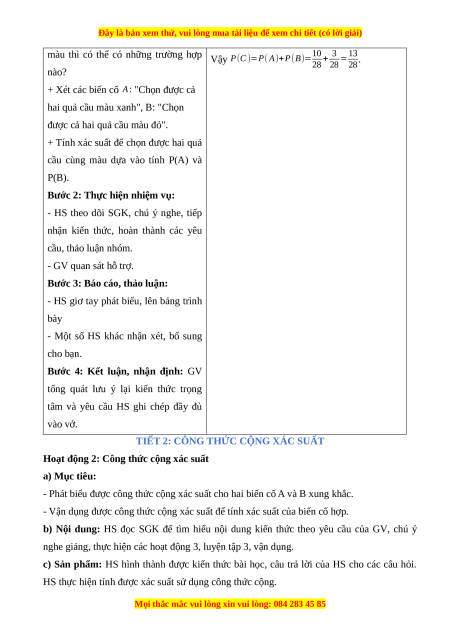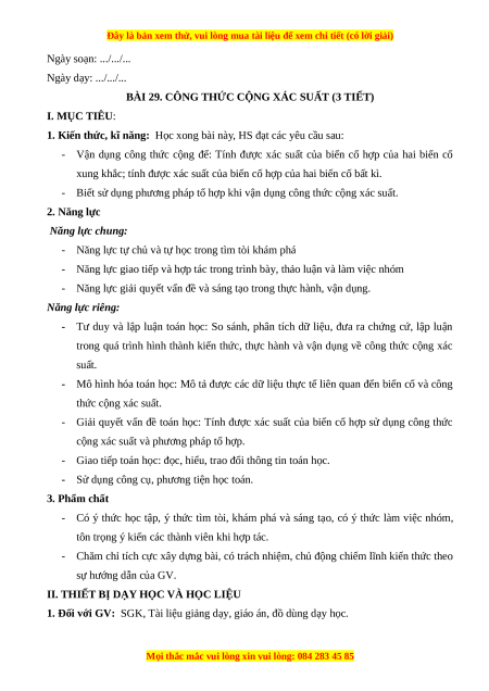 BÀI 29. CÔNG THỨC CỘNG XÁC SUẤT (3 TIẾT) I. MỤC TIÊU: