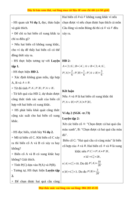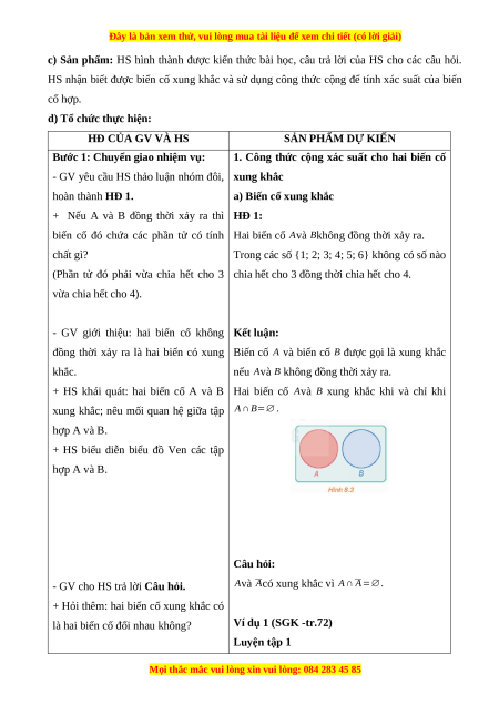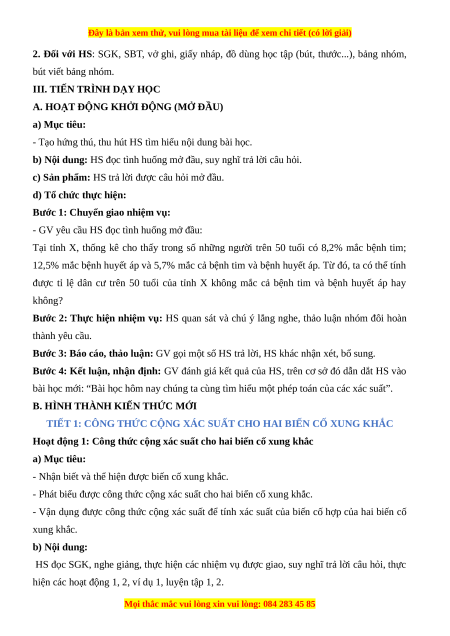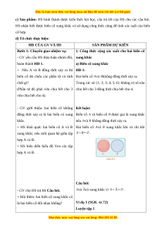 - Vận dụng được công thức cộng xác suất để tính xác suất của biến cố hợp của hai biến cố xung khắc. b) Nội dung: