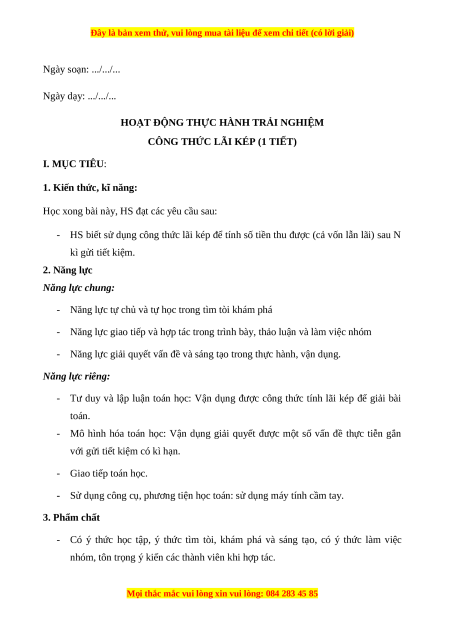 CÔNG THỨC LÃI KÉP (1 TIẾT) I. MỤC TIÊU: