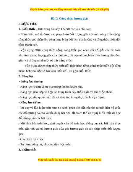 Đây là bản xem th , vu ử i lòng mua tài li u ệ đ xe ể m chi ti t (c ế ó l i ờ gi i ả ) Bài 2. Công th c l ứ ư ng gi ợ ác I. M C Ụ TIÊU 1. Ki n t ế h c ứ : H c ọ xong bài này, HS đ t ạ các yêu c u s ầ au: - Nh n ậ bi t ế , mô tả đư c ợ các phép bi n ế đ i ổ lư ng ợ giác cơ b n: ả công th c ứ c ng; ộ công th c