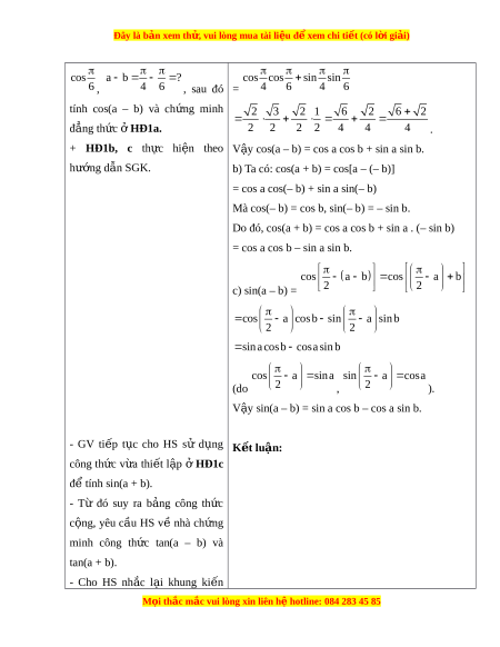 Đây là bản xem th , vu ử i lòng mua tài li u ệ đ xe ể m chi ti t (c ế ó l i ờ gi i ả ) cos a b ? cos cos sin sin 6 , 4 6 , sau đó = 4 6 4 6 tính cos(a – b) và ch ng ứ minh 2 3 2 1 6 2 6 2 đ ng t ẳ h c ứ ở HĐ1a. 2 2 2 2 4 4 4 . + HĐ1b, c th c ự hi n ệ theo V y