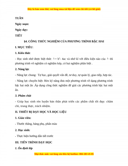 §4. CÔNG THỨC NGHIỆM CỦA PHƯƠNG TRÌNH BẬC HAI I. MỤC TIÊU: 1. Kiến thức
