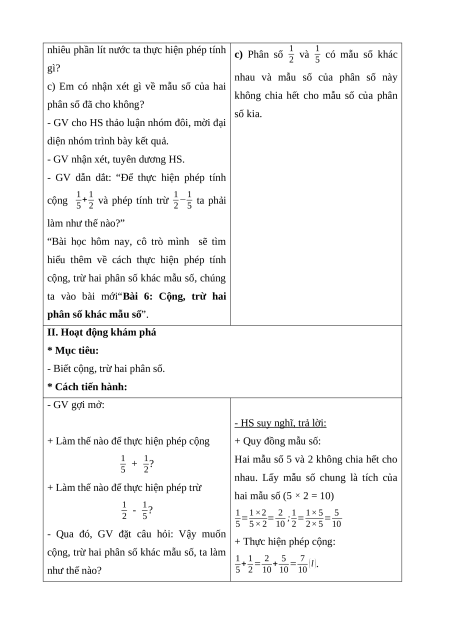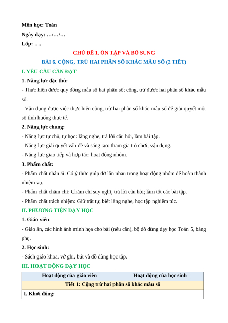 BÀI 6. CỘNG, TRỪ HAI PHÂN SỐ KHÁC MẪU SỐ (2 TIẾT)