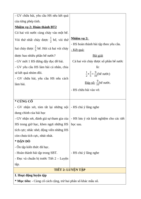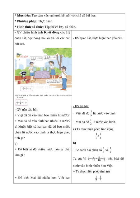 - Thực hiện được quy đồng mẫu số hai phân số; cộng, trừ được hai phân số khác mẫu số.
