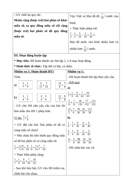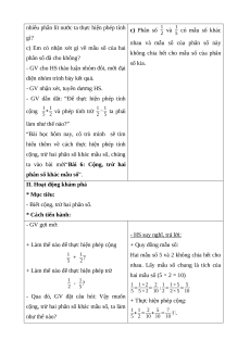 Giáo án Cộng, trừ hai phân số khác mẫu số Toán lớp 5 Kết nối tri thức