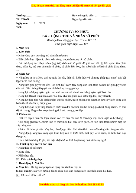 Giáo án Cộng, trừ và nhân số phức Toán 12 Giải tích