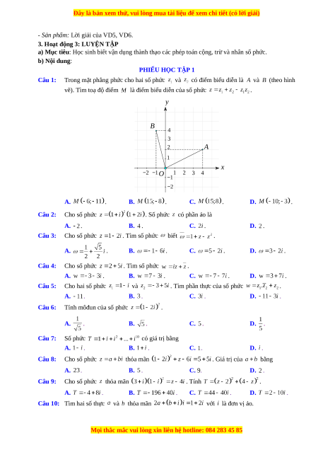 a) Mục tiêu: Học sinh biết vận dụng thành thạo các phép toán cộng, trừ và nhân số phức. b) Nội dung: PHIẾU HỌC TẬP 1 Câu 1: