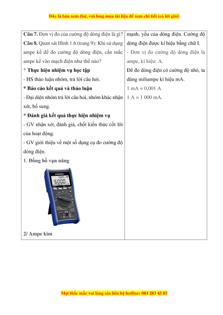 Câu 7. Đơn vị đo cường độ dòng điện là ampe: kí hiệu: A.