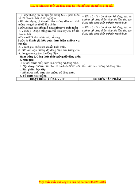 Đây là bản xem th , vu ử i lòng mua tài li u ệ đ xe ể m chi ti t ế (có l i ờ gi i ả ) - GV cho HS đ c ọ và tr l ả ời câu h i ỏ ở ví d m ụ ở đ u bà ầ i h c ọ . - N i ộ dung câu h i ỏ là: “Cư ng ờ độ dòng đi n ệ là gì và đ t ặ tr ng ư cho tính ch t ấ nào c a ủ dòng đi n ệ ?” Bư c ớ 2: HS th c ự hi n ệ nhi m ệ v h ụ c ọ t p ậ