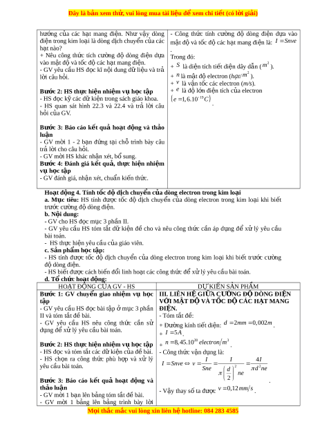 Đây là bản xem th , vu ử i lòng mua tài li u ệ đ xe ể m chi ti t ế (có l i ờ gi i ả ) Bư c ớ 1: GV chuy n ể giao nhi m v ệ h ụ c ọ t p ậ II. CÔNG TH C Ứ TÍNH CƯ N Ờ G ĐỘ - GV cho HS t đ ự c ọ SGK m c ụ 2 ph n ầ I, hư ng ớ d n ẫ DÒNG ĐI N Ệ . HS thảo lu n ậ để từ đó h c ọ sinh vi t ế đư c ợ bi u ể - Đi n ệ lư ng ợ di chuy n ể qua ti t ế di n ệ th ng ẳ th c ứ tính cư ng đ ờ dòng đi ộ ện. c a ủ dây d n ẫ trong m t ộ đ n ơ vị th i ờ gian đư c ợ - GV yêu c u ầ HS từ công th c ứ tính cư ng ờ độ dòng g i ọ là cư ng ờ đ dòng đi ộ n. ệ đi n vi ệ ết ra công th c ứ tính đi n l ệ ư ng. ợ - Cư ng ờ độ dòng đi n ệ đư c ợ tính b ng ằ công