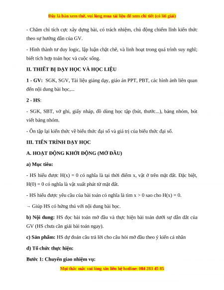 - HS hiểu được H(x) = 0 có nghĩa là tại thời điểm x, vật ở trên mặt đất. Đặc biệt,