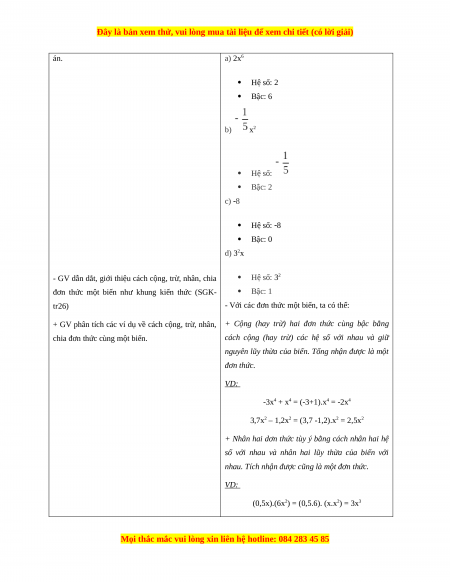 - HS thực hiện được cộng hai đơn đơn thức cùng bậc và nhân hai đơn thức tùy ý. b) Nội dung:
