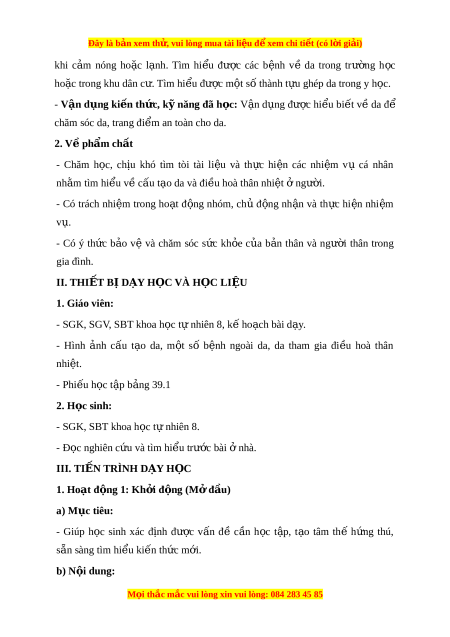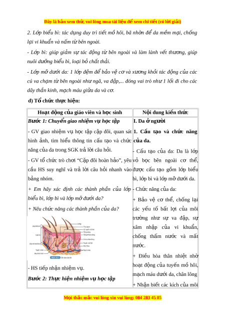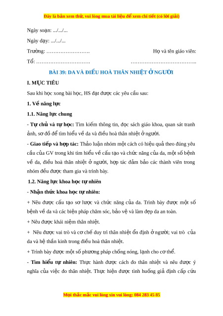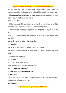 Đây là bản xem th , vu ử i lòng mua tài li u ệ đ xe ể m chi ti t ế (có l i ờ gi i ả ) khi c m ả nóng ho c ặ l nh. ạ Tìm hi u ể đư c ợ các b nh ệ về da trong trư ng ờ h c ọ ho c ặ trong khu dân c . ư Tìm hi u đ ể ư c m ợ t ộ s t ố hành t u ghép da t ự rong y h c. ọ - V n ậ d ng ụ ki n ế th c, ứ k năng ỹ đã h c: ọ V n ậ d ng ụ đư c ợ hi u ể bi t ế v da ề để chăm sóc da, trang đi m ể an toàn cho da. 2. V ph ề ẩm ch t ấ - Chăm h c, ọ ch u ị khó tìm tòi tài li u ệ và th c ự hi n ệ các nhi m ệ vụ cá nhân nh m ằ tìm hi u ể v c ề u t ấ o da và đi ạ u hoà ề thân nhi t ệ ng ở ư i ờ . - Có trách nhi m ệ trong ho t ạ đ ng ộ nhóm, ch ủ đ ng ộ nh n ậ và th c ự hi n ệ nhi m ệ v . ụ - Có ý th c ứ b o ả vệ và chăm sóc s c ứ kh e ỏ c a ủ b n ả thân và ngư i ờ thân trong gia đình. II. THIẾT B D Ị ẠY H C Ọ VÀ H C Ọ LI U Ệ 1. Giáo viên: - SGK, SGV, SBT khoa h c ọ t nhi ự ên 8, k ho ế ch ạ bài d y ạ . - Hình nh ả c u ấ t o ạ da, m t ộ số b nh